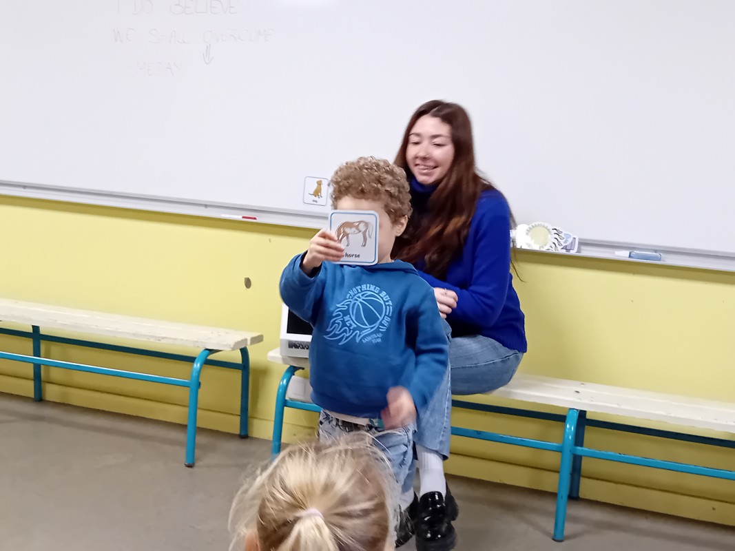 Les enfants ont participé à des petits jeux afin de mémoriser le nom de quelques animaux en anglais (pig, cat, dog, monkey, fish, horse, bear…) : retrouver l’image de l’animal placée dans la salle par Kate. (L’intervenante nomme l’animal puis l’enfant cherche l’image associée). Les élèves ont ensuite dansé sur la chanson « Baby shark »