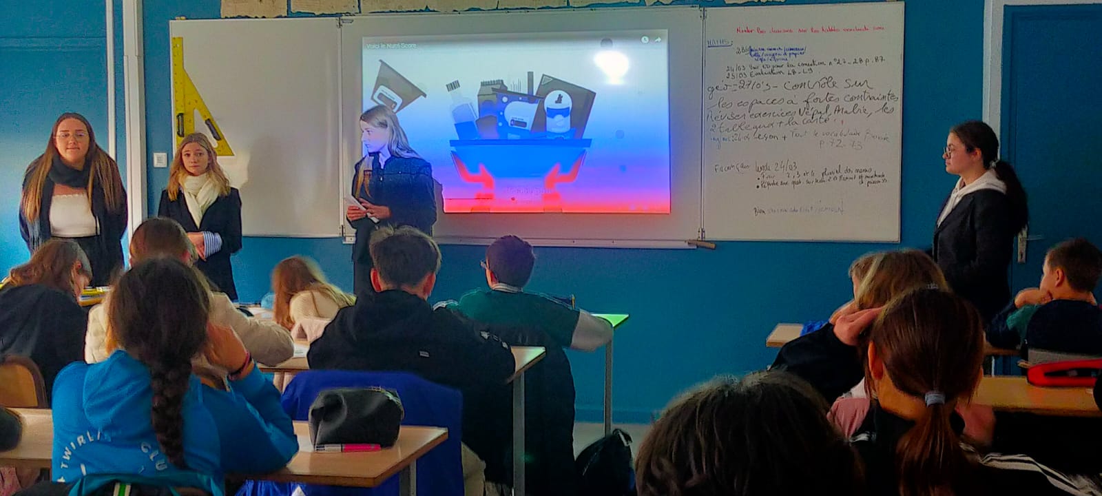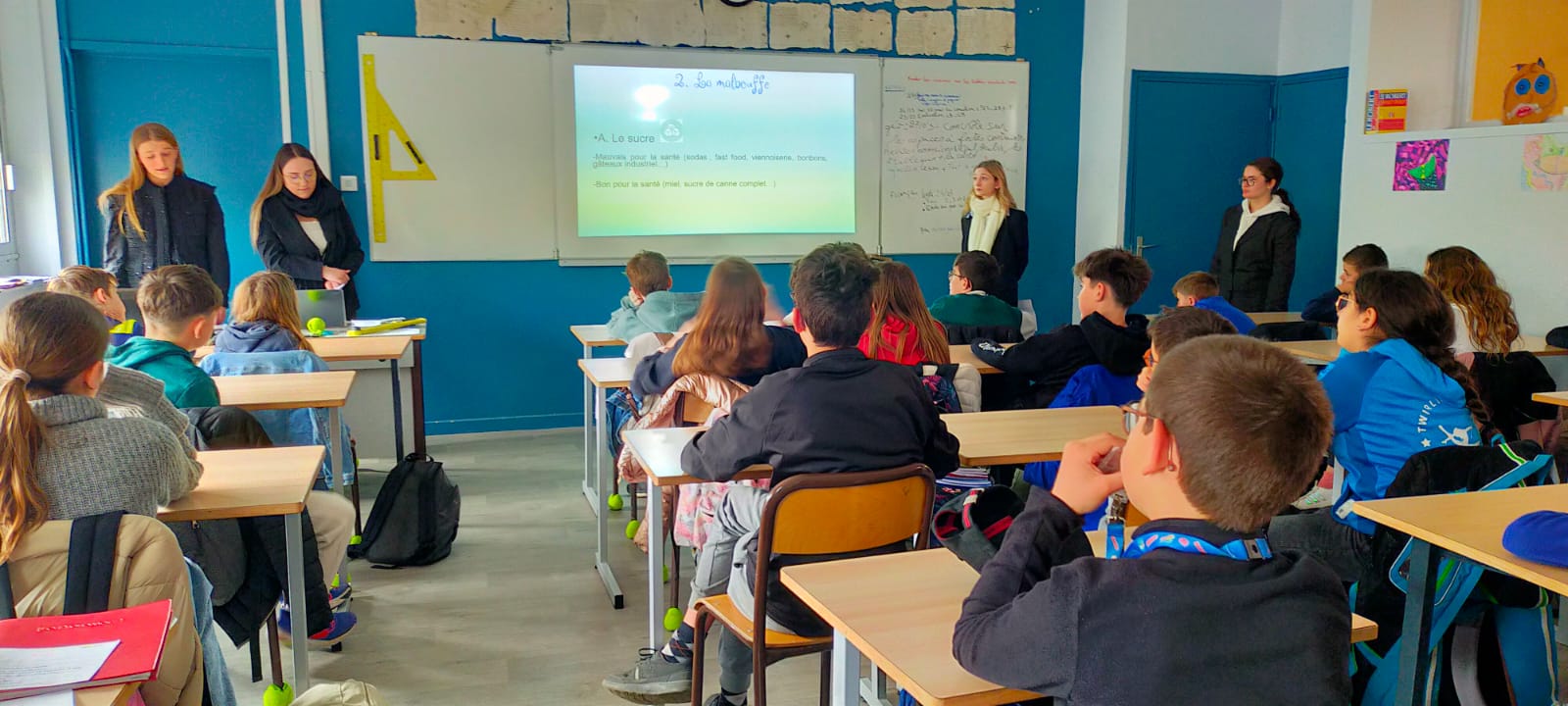 Quatre élèves de Terminale Bac Pro ASSP (Aide Soins et Services à la personne) de l'Ensemble scolaire Saint Jacques de Compostelle, encadrés par notre infirmière scolaire, sont intervenus auprès de 3 classes de 6ème du collège La Chartreuse sur le thème de la "Malbouffe". Les élèves ont pu distinguer les aliments recommandés et ceux à réduire pour un meilleur équilibre alimentaire et repartir avec quelques conseils nutritionnels !