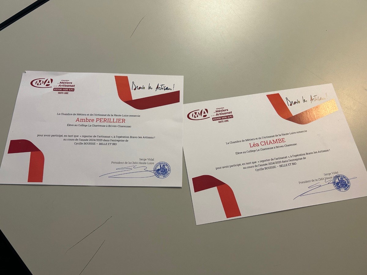 Les classes de 4eme du collège La Chartreuse ont participé cette année à une action intitulée "BRAVO les Artisans" proposée par la CMA (Chambre des Métiers et de l'Artisanat).