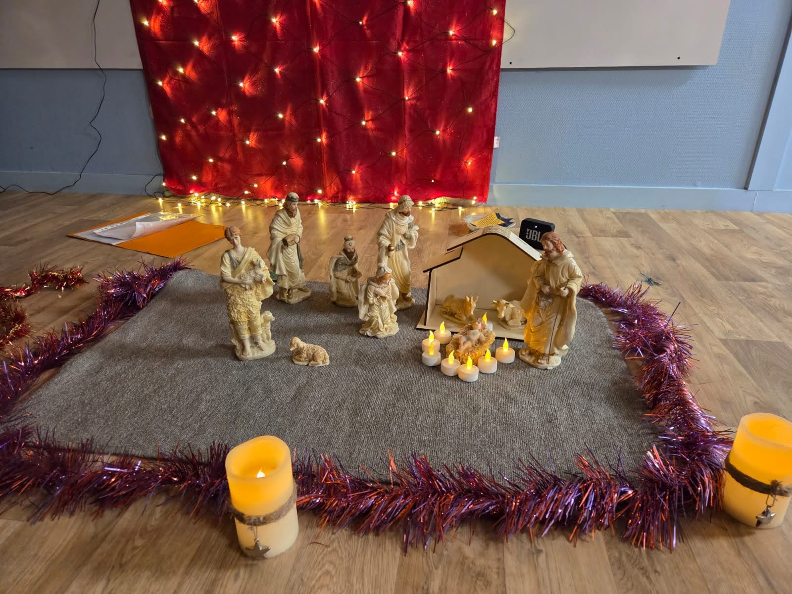 Après une séance de préparation à l'Avent fin novembre, les élèves des 3 classes de maternelle se sont retrouvés, jeudi 18 décembre, pour célébrer la naissance de Jésus. Maîtresse Séverine a conté la nativité en animant et mettant en scène les personnages.