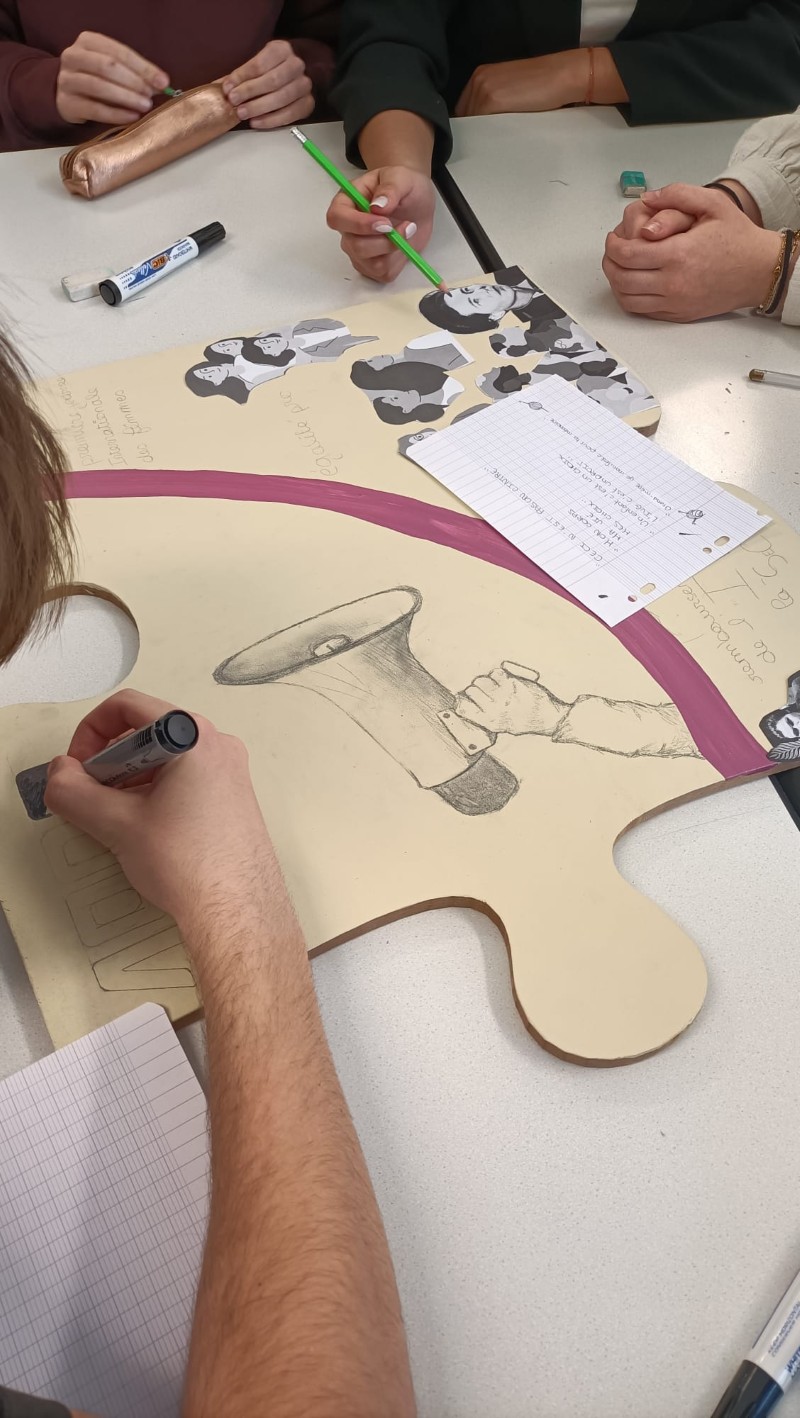 Notre lycée a eu le plaisir de participer à cette initiative. Les élèves ont ainsi réfléchi et réalisé trois pièces du puzzle, chacune illustrant une date clé dans l’histoire des droits des femmes :