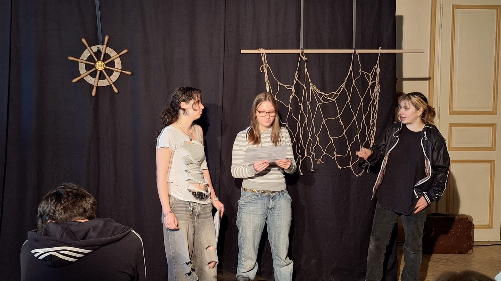 Toujours sous l'impulsion de la professeure d'anglais Mme Chalier, cette journée d'immersion a démarré sur les chapeaux de roues. Dès 10h30, les élèves ont pu assister à la nouvelle pièce de la troupe, intitulée "Fish & Ships". Fidèle à son ADN, la compagnie a proposé un spectacle 100% participatif : après un échauffement et une répétition matinale privilégiée avec les trois acteurs professionnels, 6 lycéens ont eu la chance de monter sur les planches pour donner la réplique à la troupe !