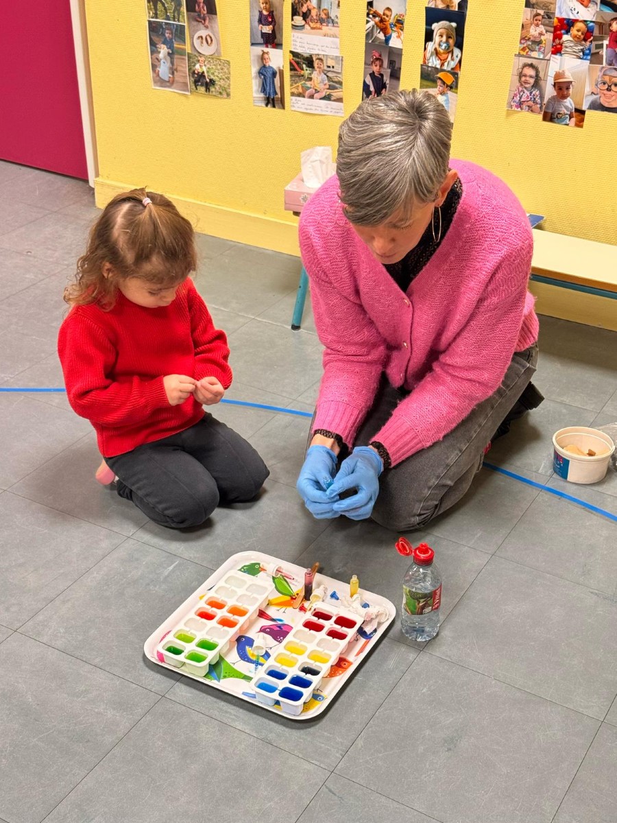 Les élèves ont ensuite utilisé ces glaçons colorés pour réaliser une "aquarelle". Là aussi, c'est l'occasion de faire des constats : "Le glaçon il coule. Ça fait de l'eau. Le glaçon il devient tout petit..."