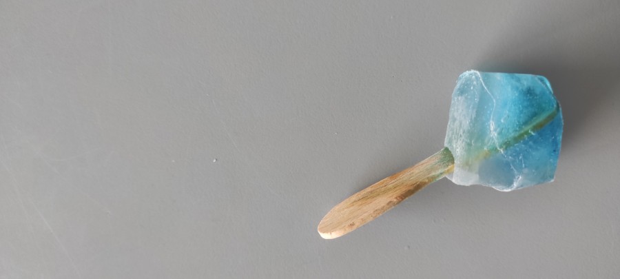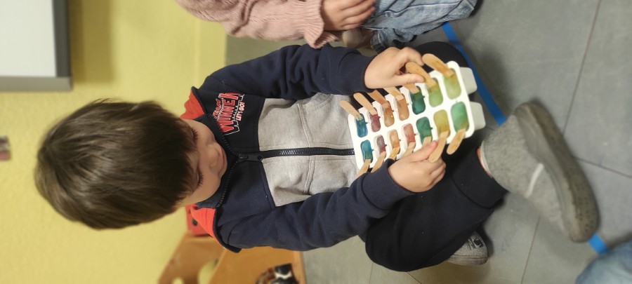 Le lendemain, nous avons sorti les bacs du congélateur après y avoir passé toute la nuit. Les enfants observent, touchent et commentent : "C'est très froid, dur. Le bâtonnet il est coincé dans l'eau. C'est comme un glaçon..."