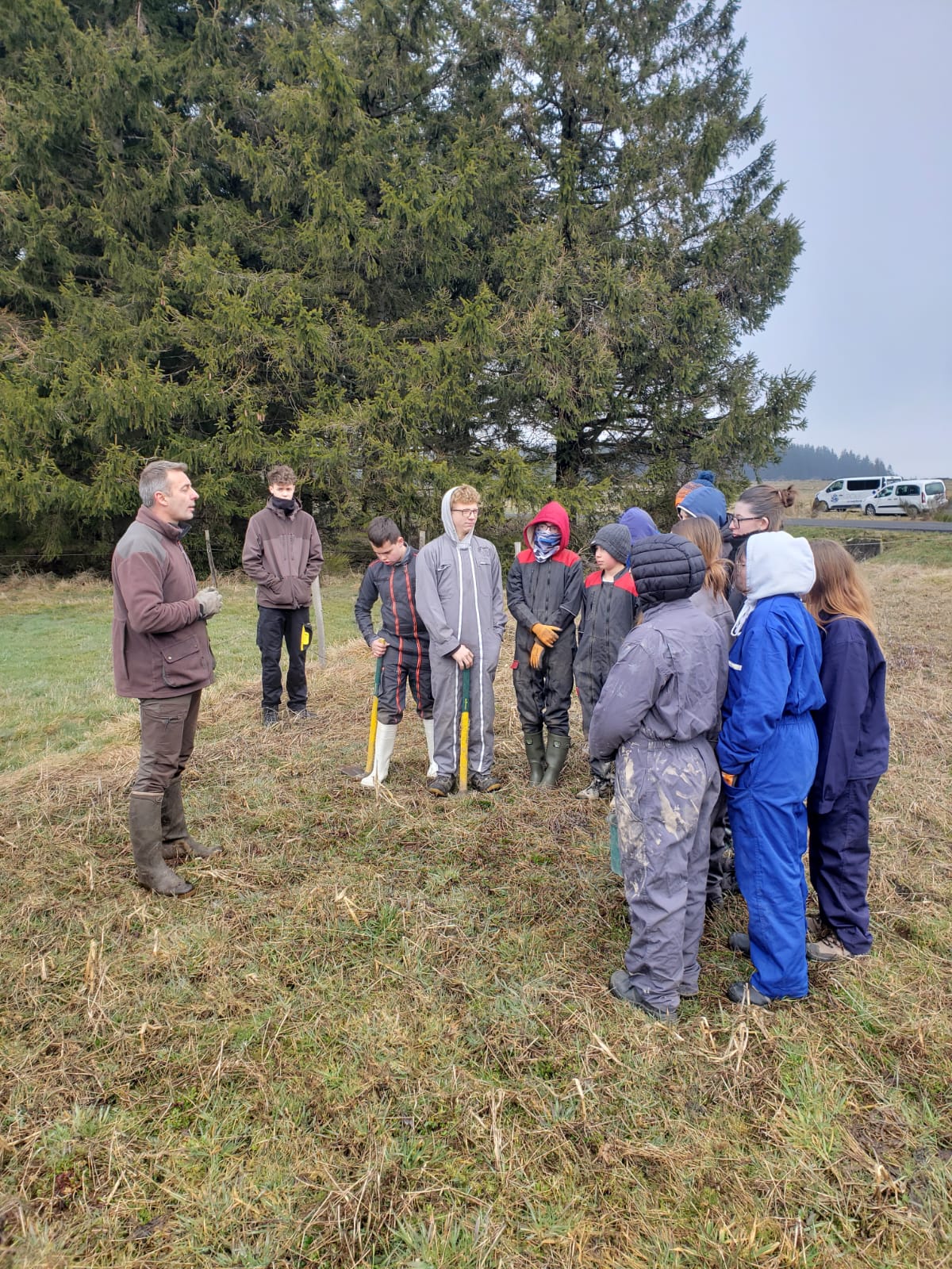 Dans le cadre de leurs ateliers ERE (Espace Rural et Environnement), les élèves de 4ème SEGPA se sont rendus à Présailles pour planter une haie bocagère en partenariat avec la fédération des chasseurs de la Haute Loire.