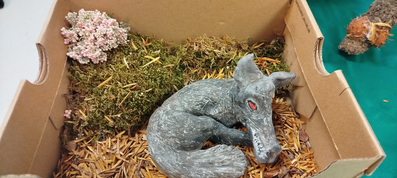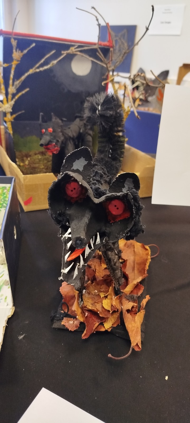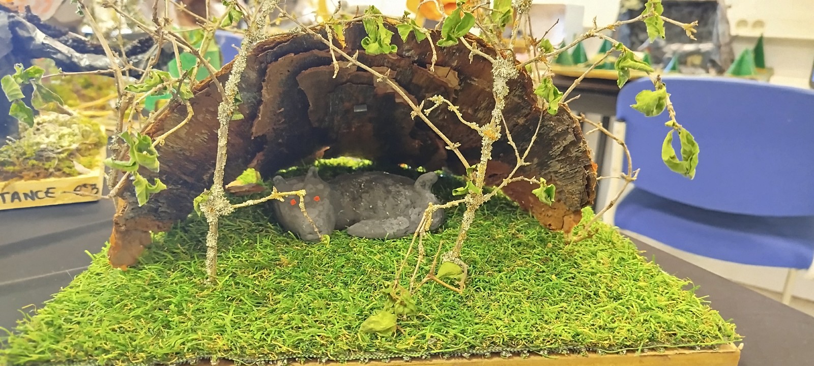 Mme Crespy, en art plastique a proposé un projet ou chaque élève de 6ème devaient créer une "bête" sortie de leur imagination. Avec des matériaux recyclés : Bois, écorces, bouteille, argile, carton...
