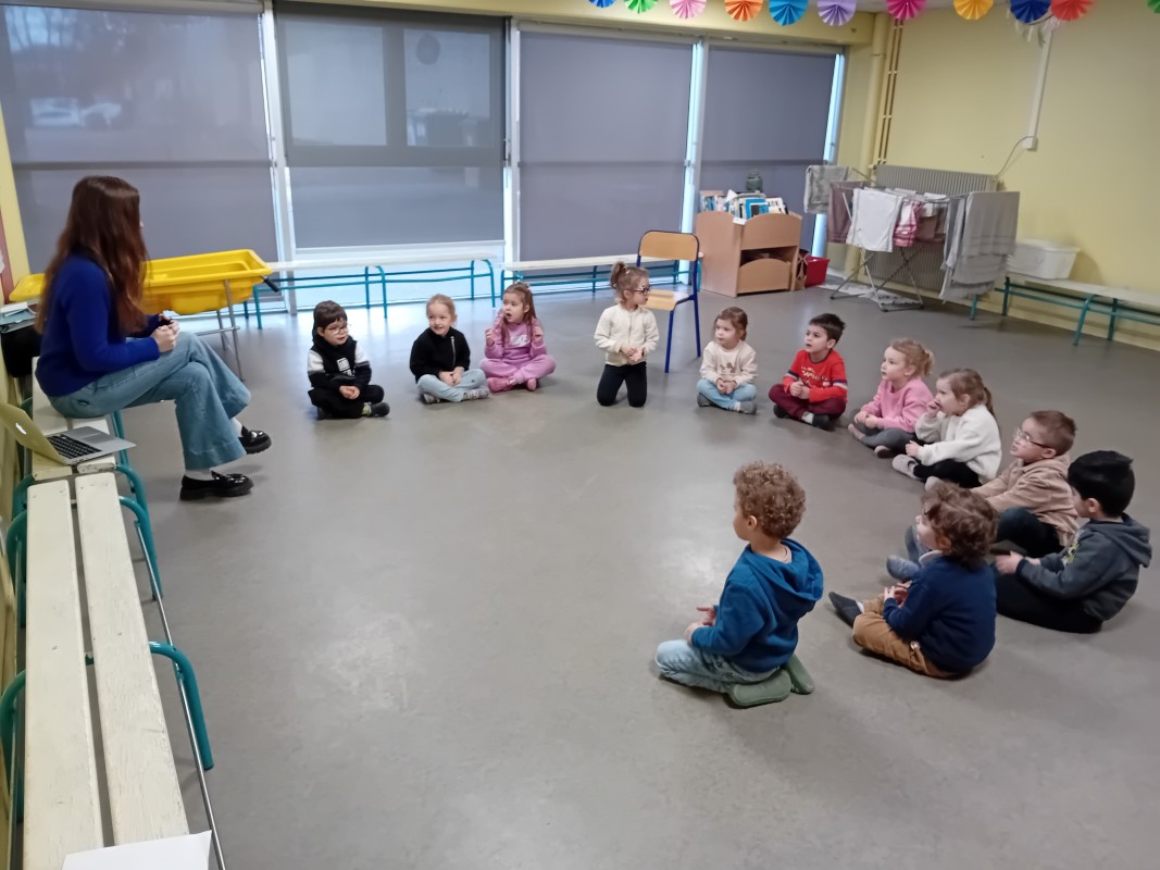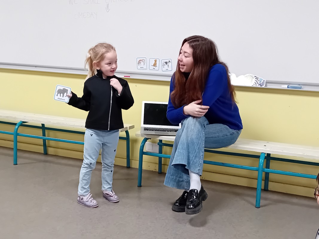 Les enfants ont participé à des petits jeux afin de mémoriser le nom de quelques animaux en anglais (pig, cat, dog, monkey, fish, horse, bear…) : retrouver l’image de l’animal placée dans la salle par Kate. (L’intervenante nomme l’animal puis l’enfant cherche l’image associée). Les élèves ont ensuite dansé sur la chanson « Baby shark »