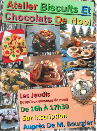 Sur inscription, les lycéens peuvent suivre un atelier pratique les initiant à la fabrication de biscuits et chocolats de Noël. De 16h à 17h30, ils découvrent des recettes gourmandes pour se faire plaisir pendant les fêtes. Encadrés par M Bourgier, ses ateliers connaissent déjà un vif succès !