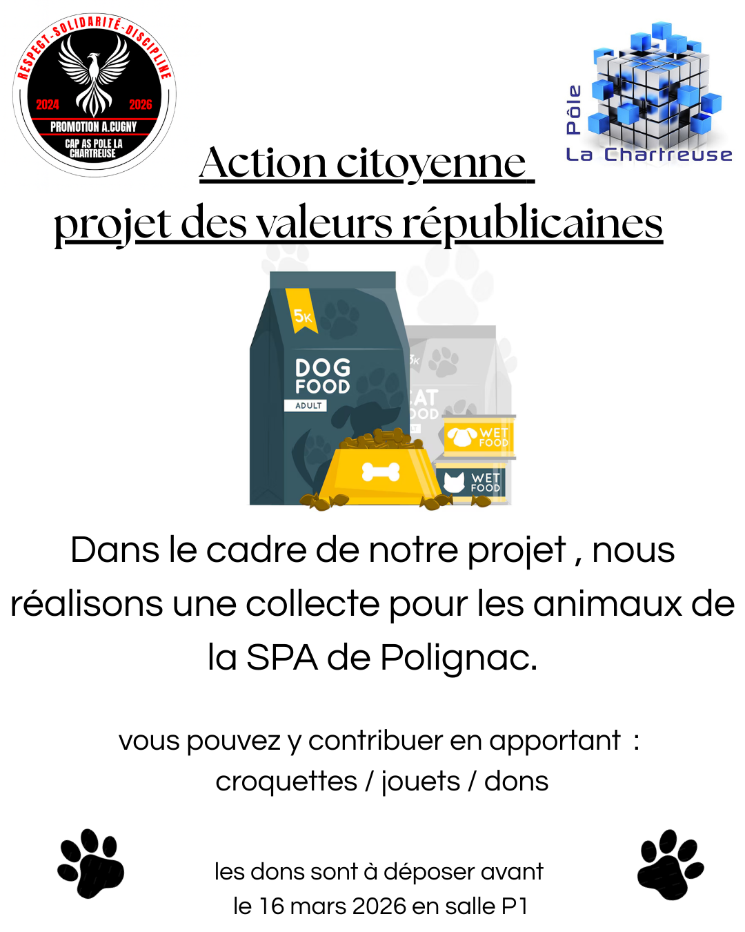 Collecte solidaire - Les élèves de la classe de CAP Agent de Sécurité du lycée professionnel La Chartreuse Paradis réalisent une collecte de croquettes, de jouets ou autres dons pour les animaux de la SPA de Polignac.