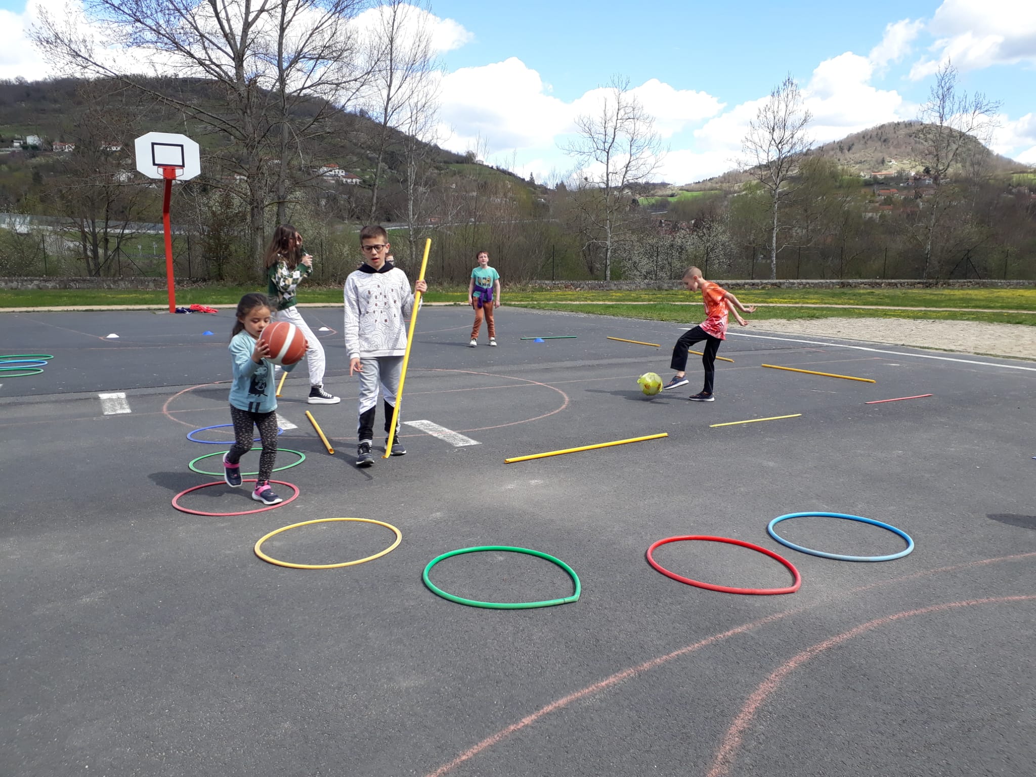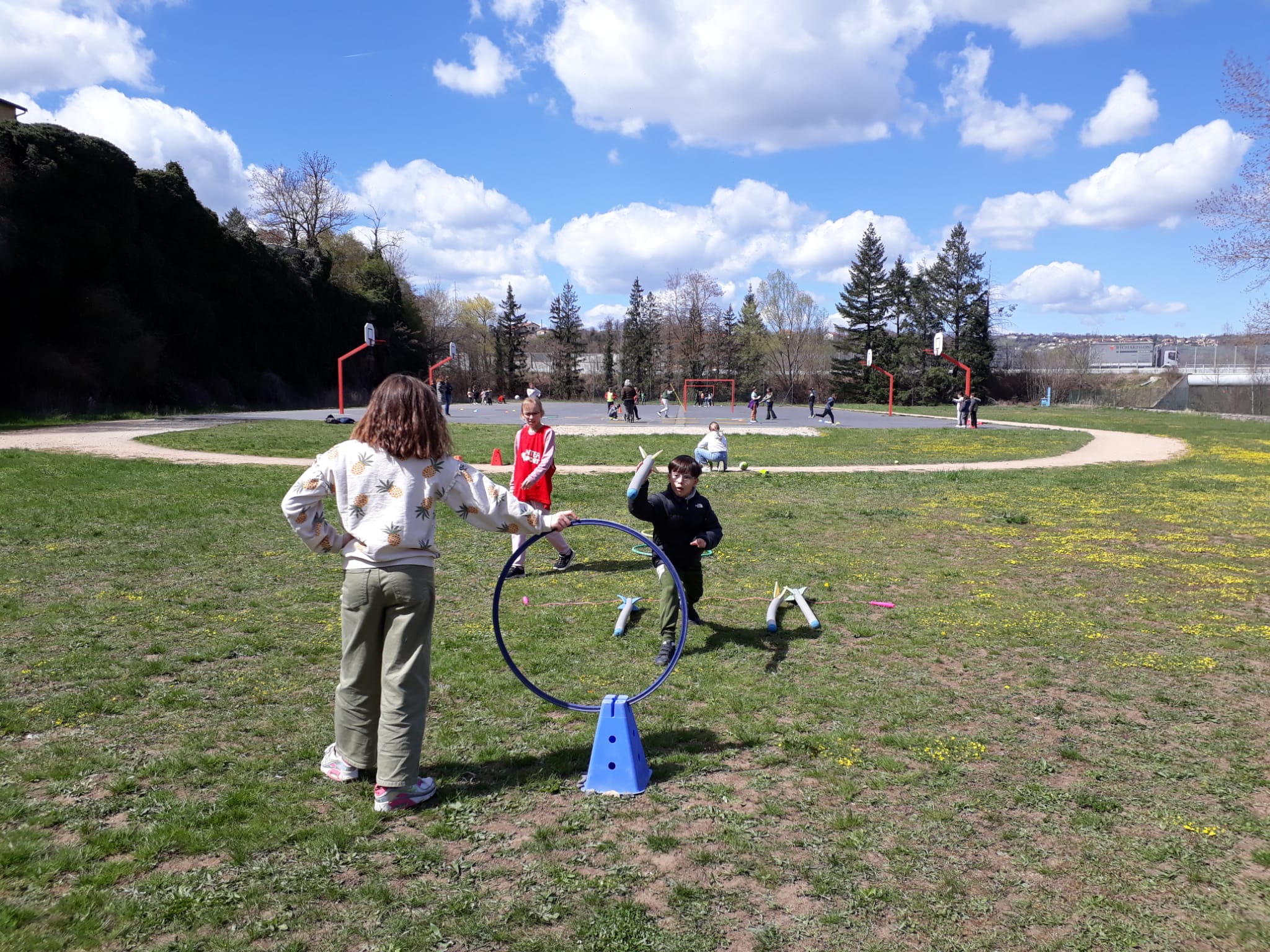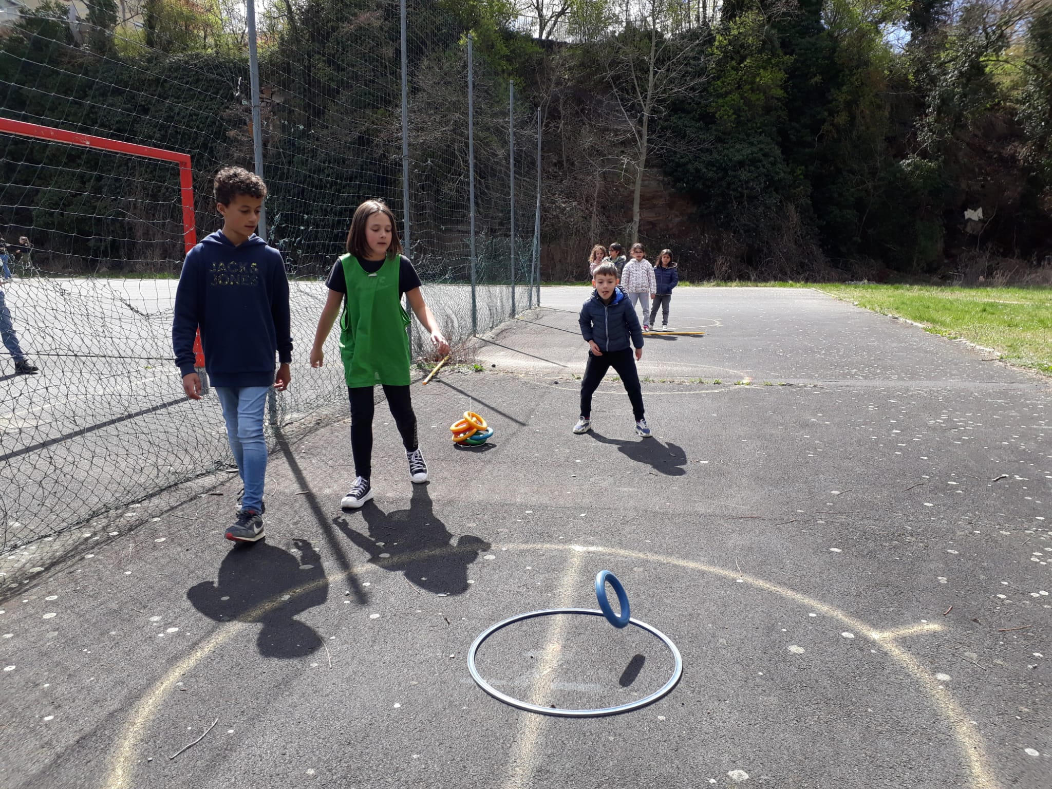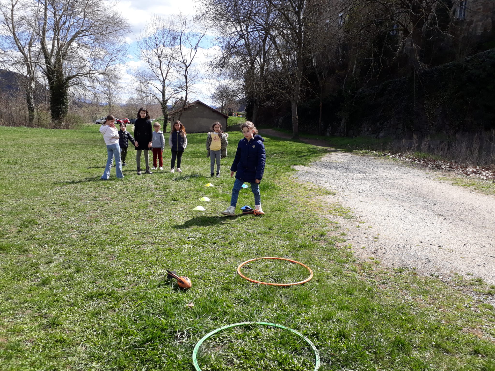 La classe de CM1 CM2 avait organisé des ateliers sportifs pour la classe de CP CE1. Les plus grands encadraient les plus jeunes sur des parcours d'adresse, de lancers... Ce temps convivial s'est terminé par une chasse aux oeufs collective.