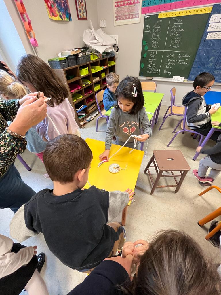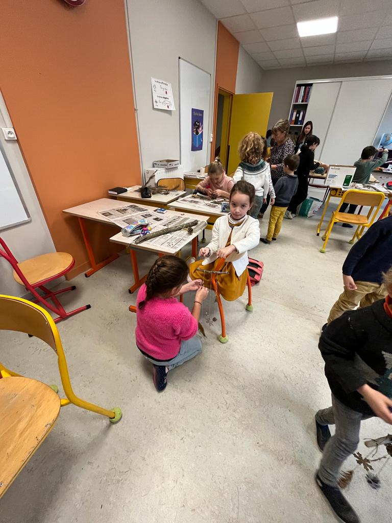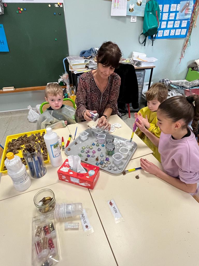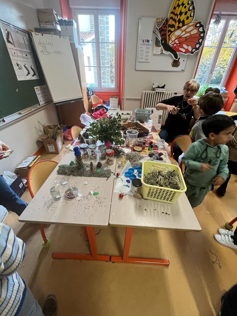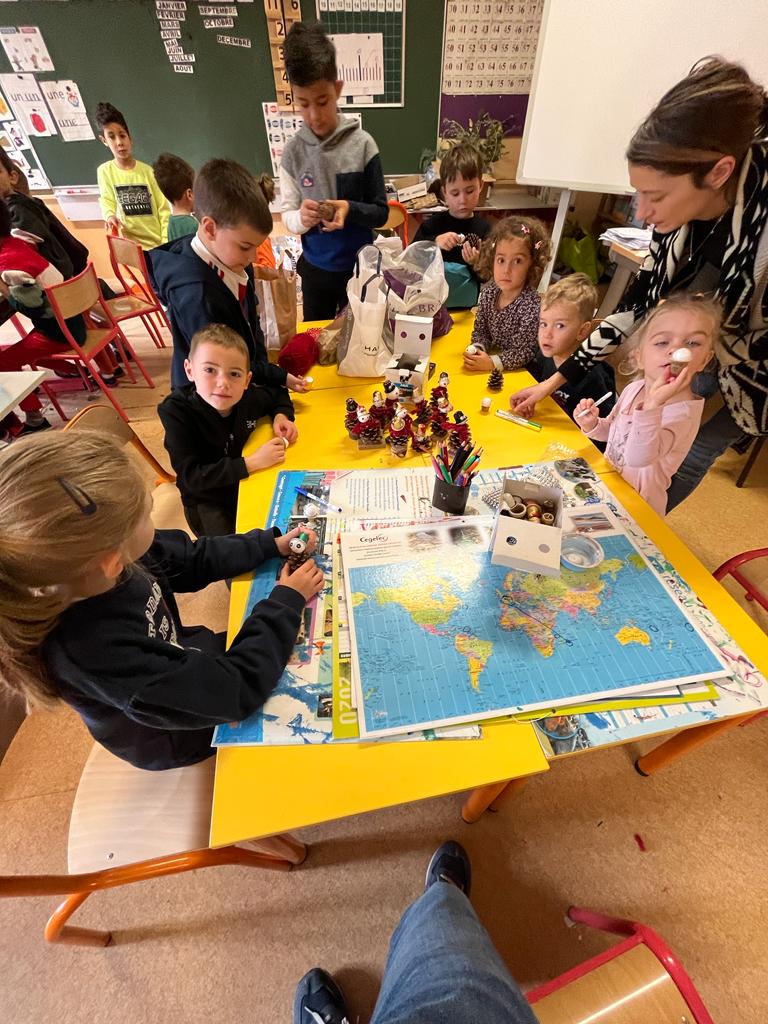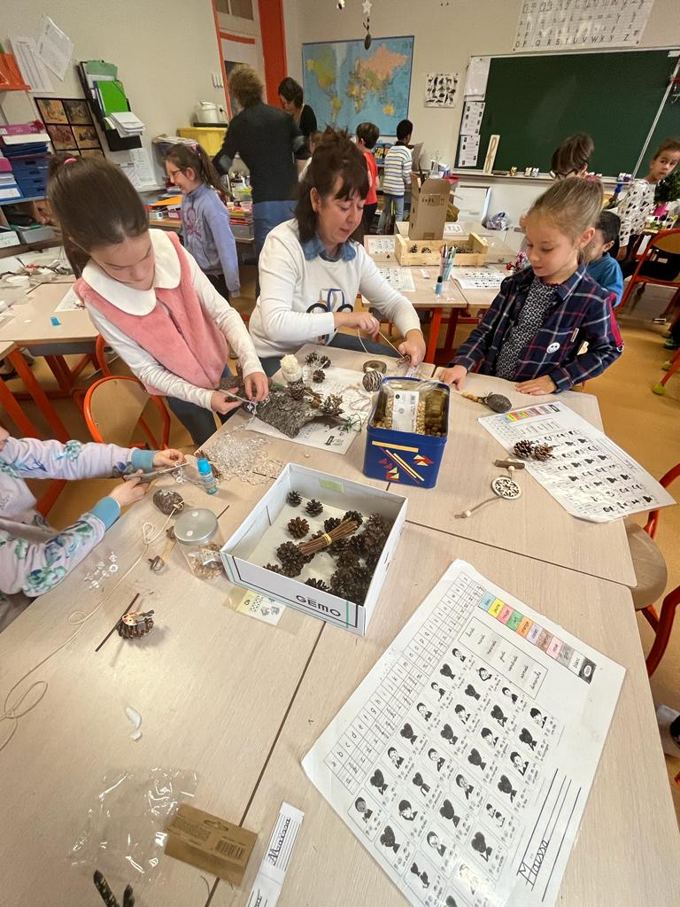 En prévision du marché de Noël prévu le 15 décembre en fin de journée, l'école a invité les parents et grands-parents à venir aider les enfants, le temps d'une demi-journée, à fabriquer les objets vendus ce jour-là. Pour ces ateliers, les classes ont été mélangées : les CM2 sont allés en PS avec également des CP par exemple. A 10h, nous avons bien sûr partagé un petit goûter tous ensemble.