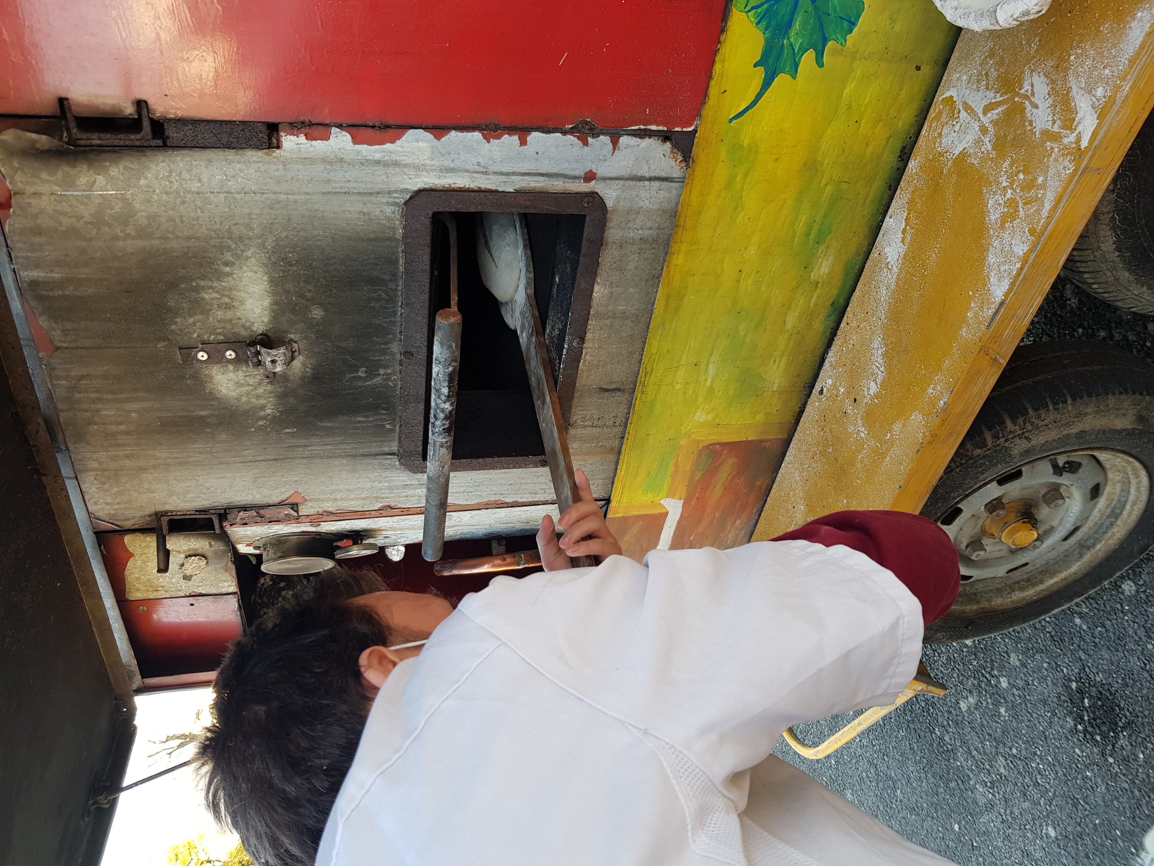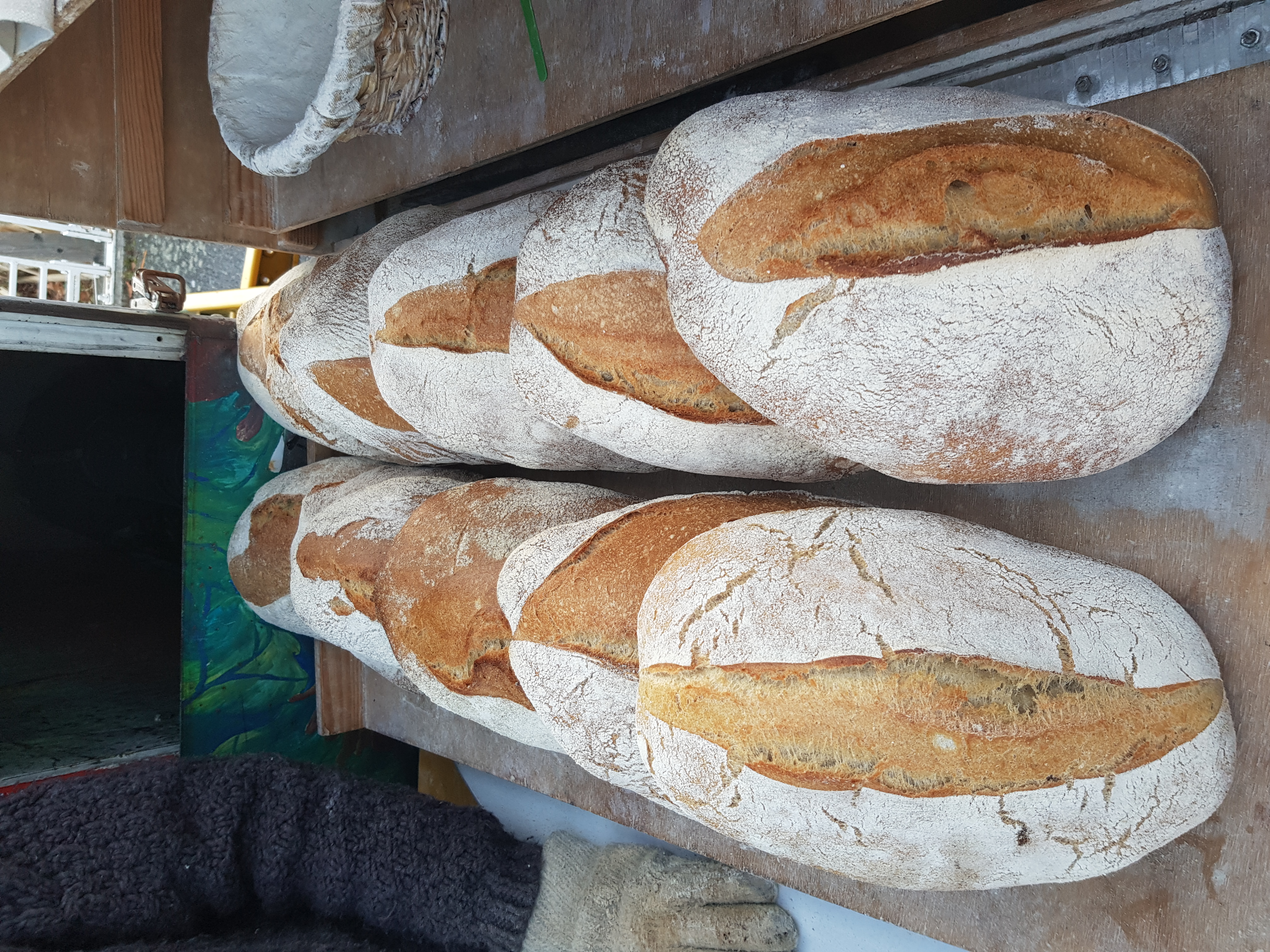 - Pétrissage de la pâte, façonnage des pâtons, cuisson du pain dans un four à pain mobile