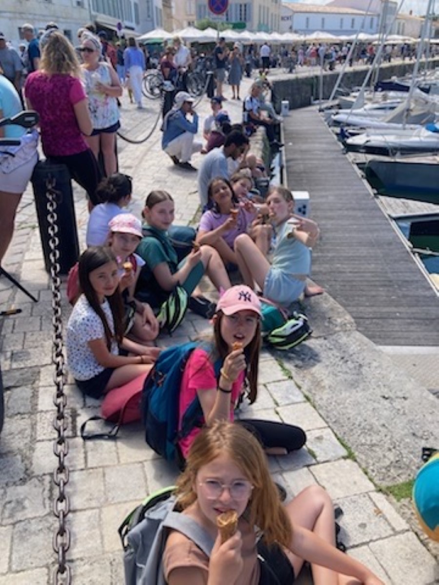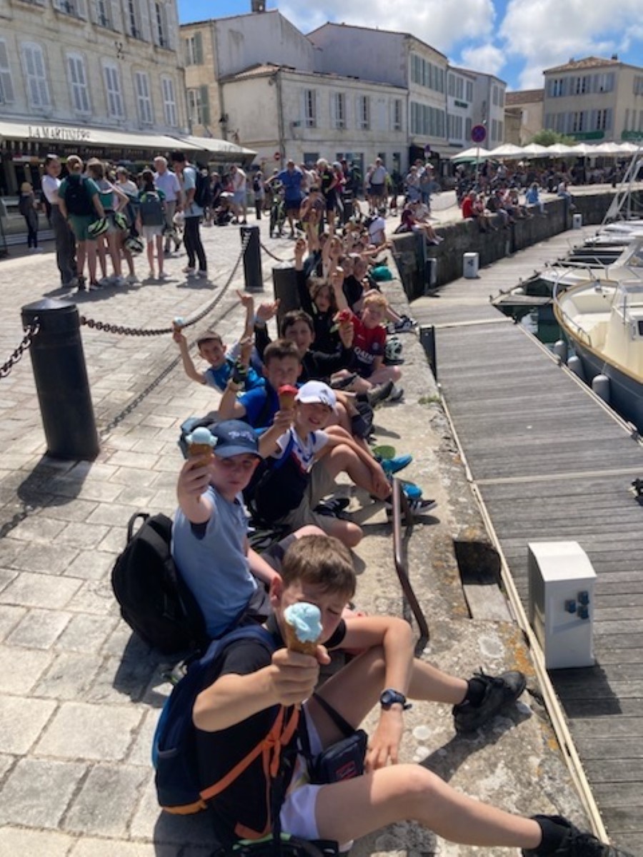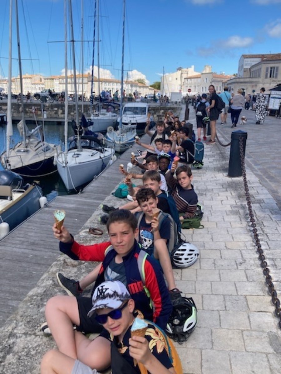 Jour 3 : Ici le temps passe vite… delà le troisième jour ! Si au réveil nous avons eu droit à un orage, la météo s’est rapidement montrée clémente. Au programme ce matin, la pêche à pieds. Nous avons pêché des moules, des crabes, des crevettes… et surtout nous avons pu tremper nos pieds dans l’océan et profiter un peu de la plage. Cet après-midi, nous avons repris les vélos à destination du magnifique village de St Martin en Ré. Cerise sur le gâteau les enfants ont pu déguster une succulente glace « La Martinière » institution Rhétaise.