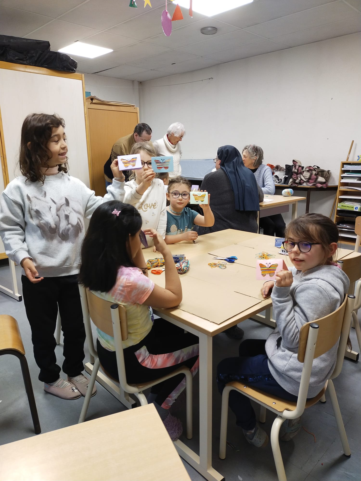 Les enfants de primaire ont accueilli des bénévoles de l'association La Tente de la Rencontre accompagnés de Sœur Anne Catherine. Ils ont ainsi décoré des galets, fabriqué ensemble des roses en papier, des papillons pour les distribuer aux résidents de deux EHPAD, l'objectif étant d'apporter un petit bonheur à leurs aînés.
