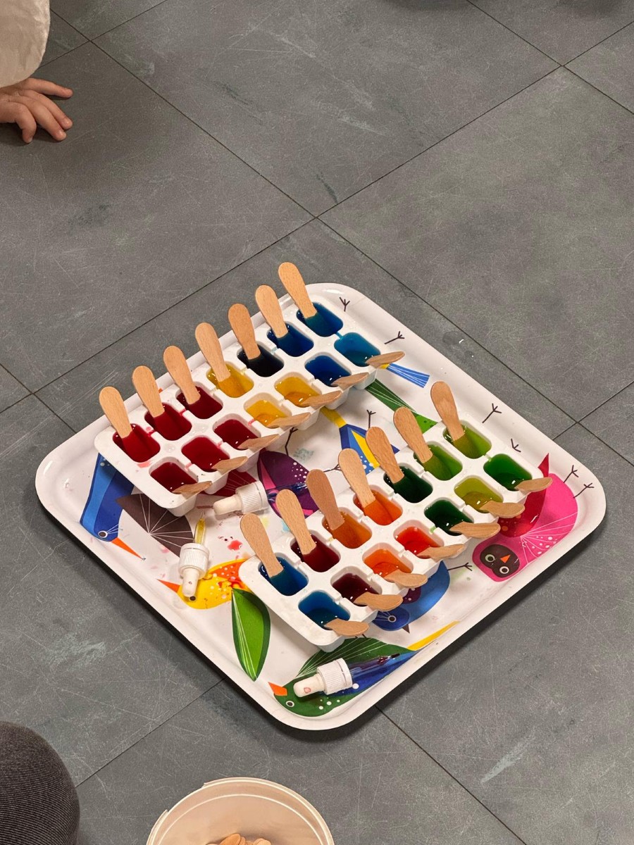 Les élèves ont ensuite utilisé ces glaçons colorés pour réaliser une "aquarelle". Là aussi, c'est l'occasion de faire des constats : "Le glaçon il coule. Ça fait de l'eau. Le glaçon il devient tout petit..."