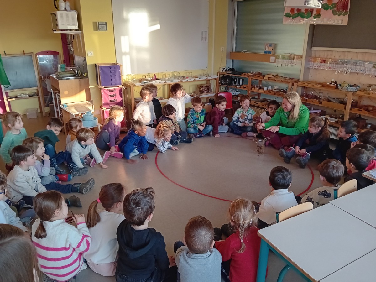 En classe, les enfants ont observé trois branches avec leurs racines, immergées dans un bocal rempli d’eau. Nalène leur a expliqué que dans la nature, la branche est la partie visible de l’arbre alors que les racines constituent la partie cachée de l’arbre, invisible tout comme l’air. L’hiver, l’arbre est au repos et va se réveiller tout doucement au printemps.