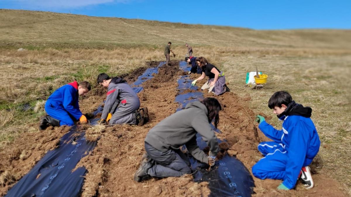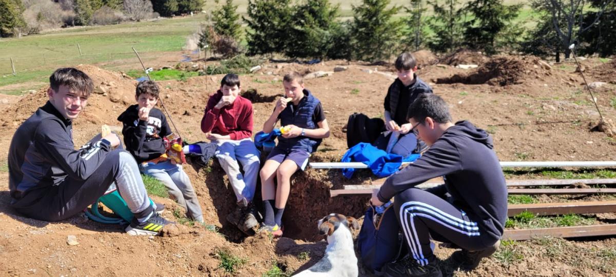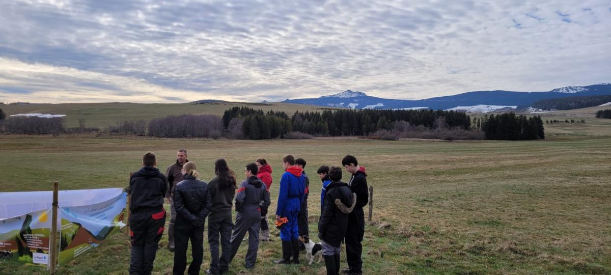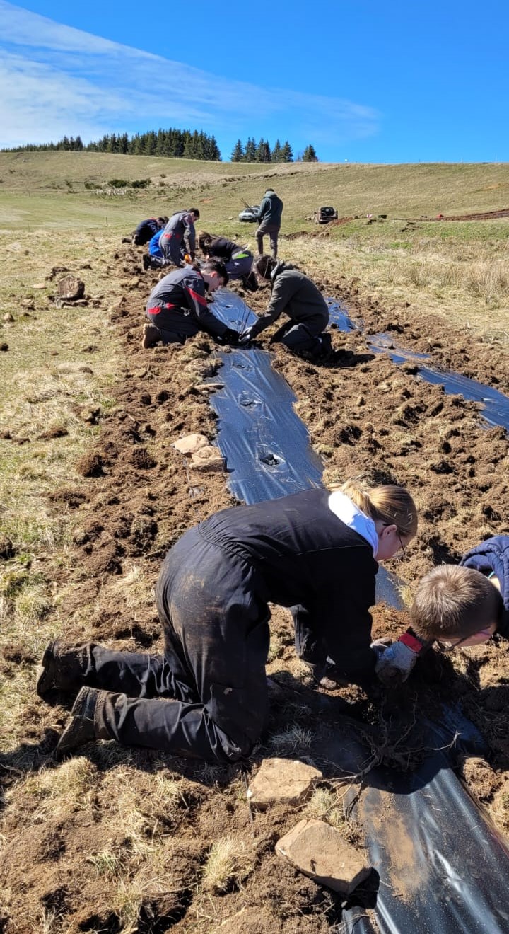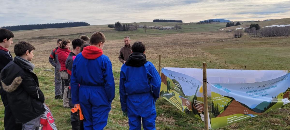 M. Giraud, technicien de la fédération des chasseurs, a présenté les bienfaits et rôles des haies bocagères (brise vent, abris et garde-manger pour la faune sauvage, lutte contre l'érosion des sols…). M. Montes, éleveur allaitant AOC fin gras du Mézenc, a présenté sa ferme et le rôle de la plantation d’une haie à cet endroit. Les élèves ont planté la haie sur une longueur de 250m, préparée en amont par M. Montes. Nous avons disposé les plants en fonction de leurs hauteurs et de leur développement adulte.