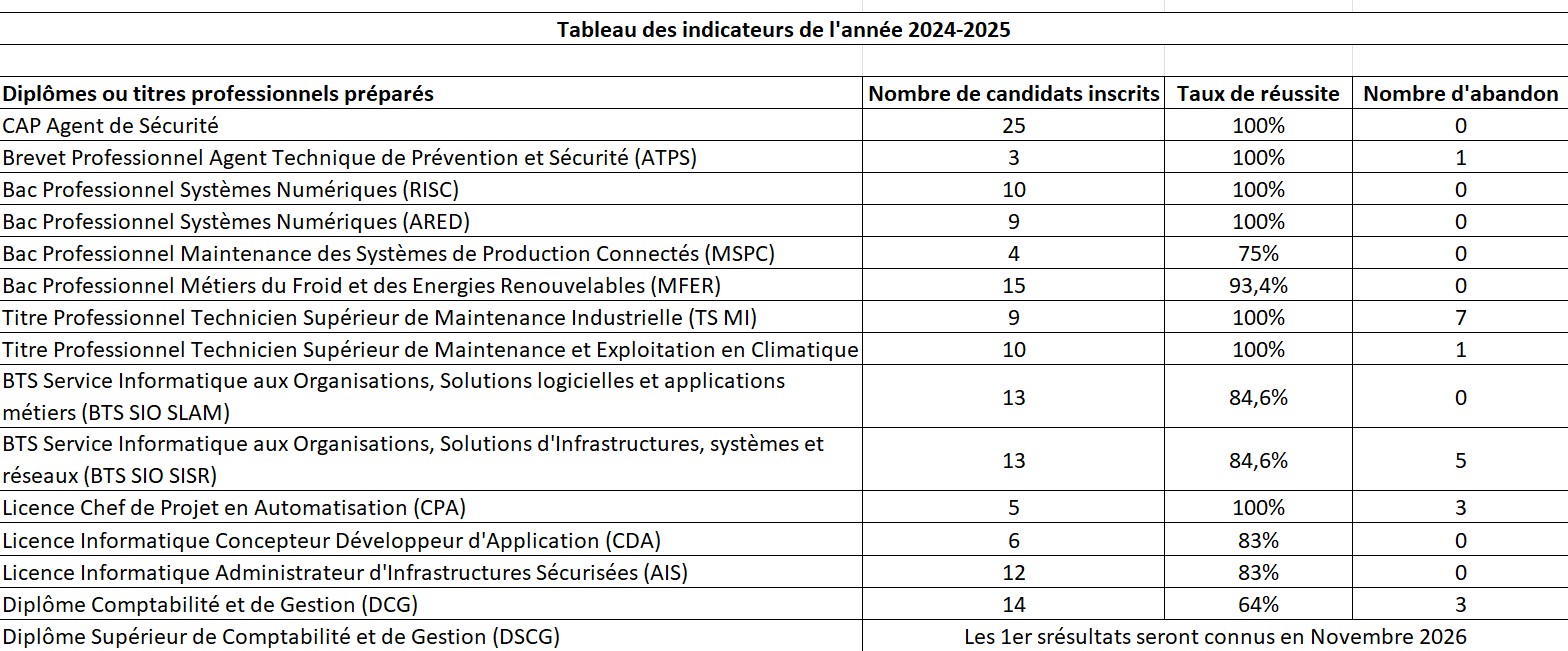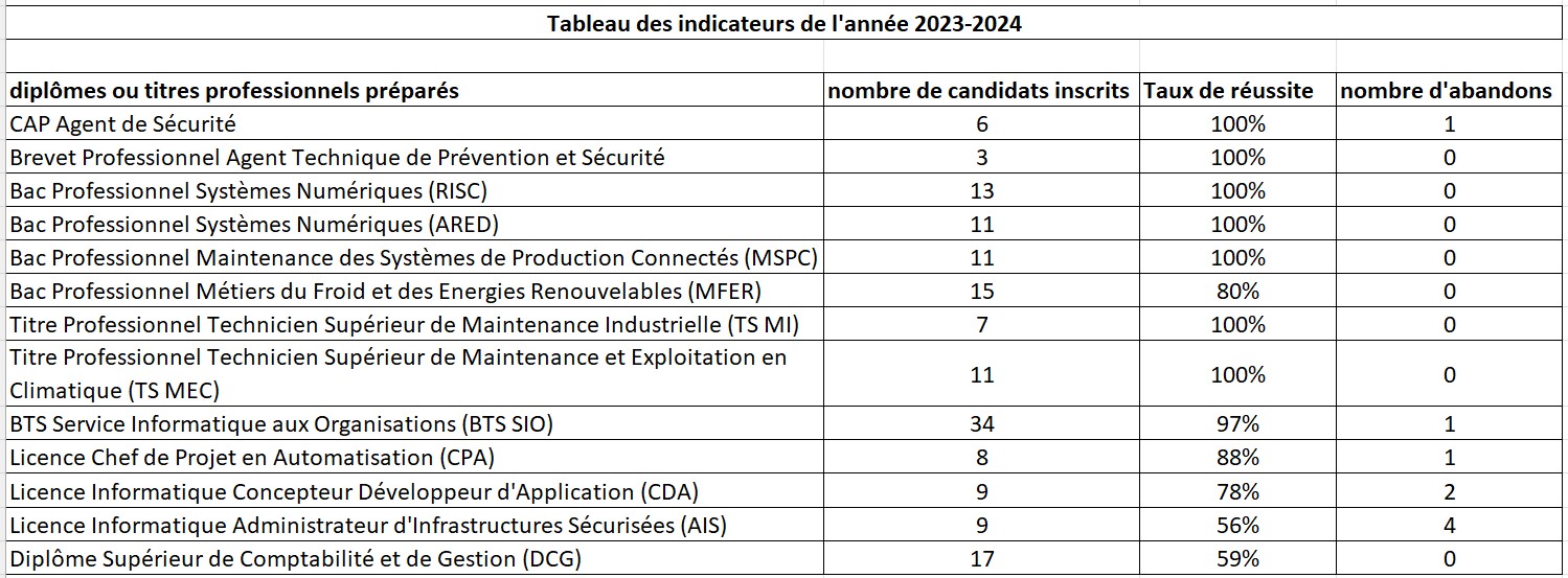 Voici le tableau des indicateurs de résultats aux examens de l'année scolaire 2023-2024 :